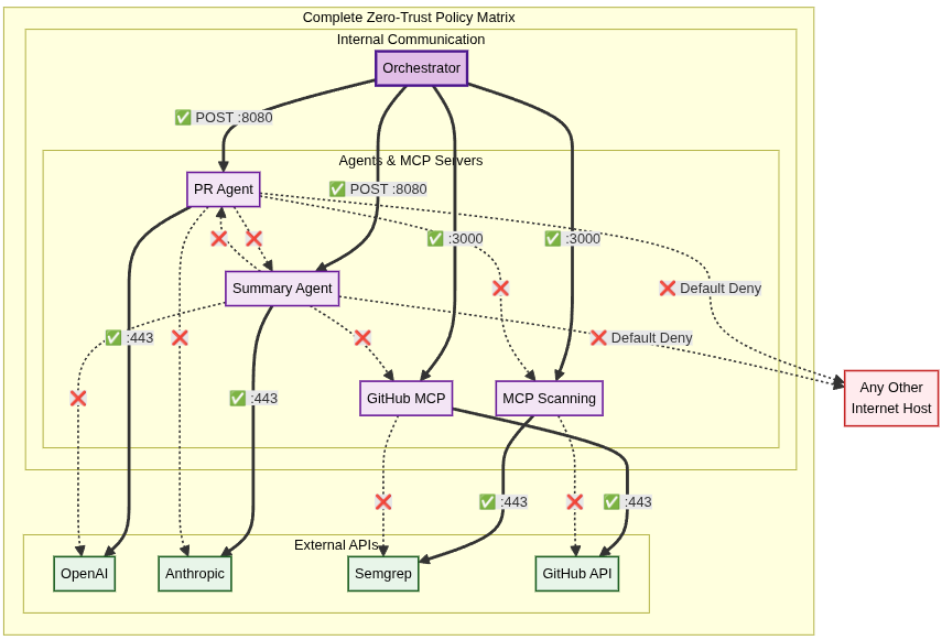 It grants the Orchestrator the only set of outbound communication paths required to coordinate the entire workflow: the PR Agent, the MCP scanning service, the Summary Agent, and the GitHub MCP server.